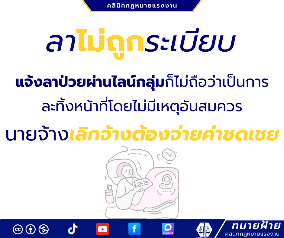 ลูกจ้างแจ้งลาป่วยผ่านไลน์กลุ่ม (ลาไม่ถูกระเบียบ) ก็ไม่ถือว่าเป็นการละทิ้งหน้าที่โดยไม่มีเหตุอันสมควร นายจ้างเลิกจ้างต้องจ่ายค่าชดเชย